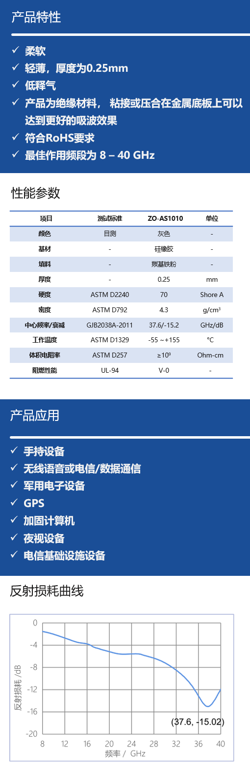 ZO-AS系列吸波材料,以硅橡膠為介質(zhì),并填充磁性粉體,專門為高入射角表面波的反射損耗而設(shè)計,適用于2-40GHz的頻段。耐高溫硅橡膠彈性體的基材中,添加耐油和阻燃助劑后制成的復(fù)合材料,其中的特殊磁性粉體讓?射角大于65°時也有優(yōu)異的吸波性能,產(chǎn)品反射率測試標(biāo)準(zhǔn)參照GJB2038A-2011。